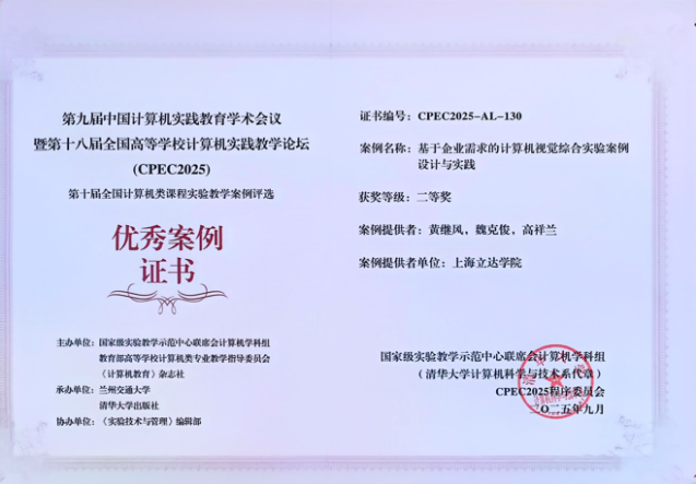 会议还表彰了年度优秀论文作者、优秀案例作者、优秀教材作者,我院黄继风教授、魏克俊、高祥兰老师提交的作品“基于企业需求的计算机视觉综合实验案例设计与实践”获优秀实验教学案例二等奖。