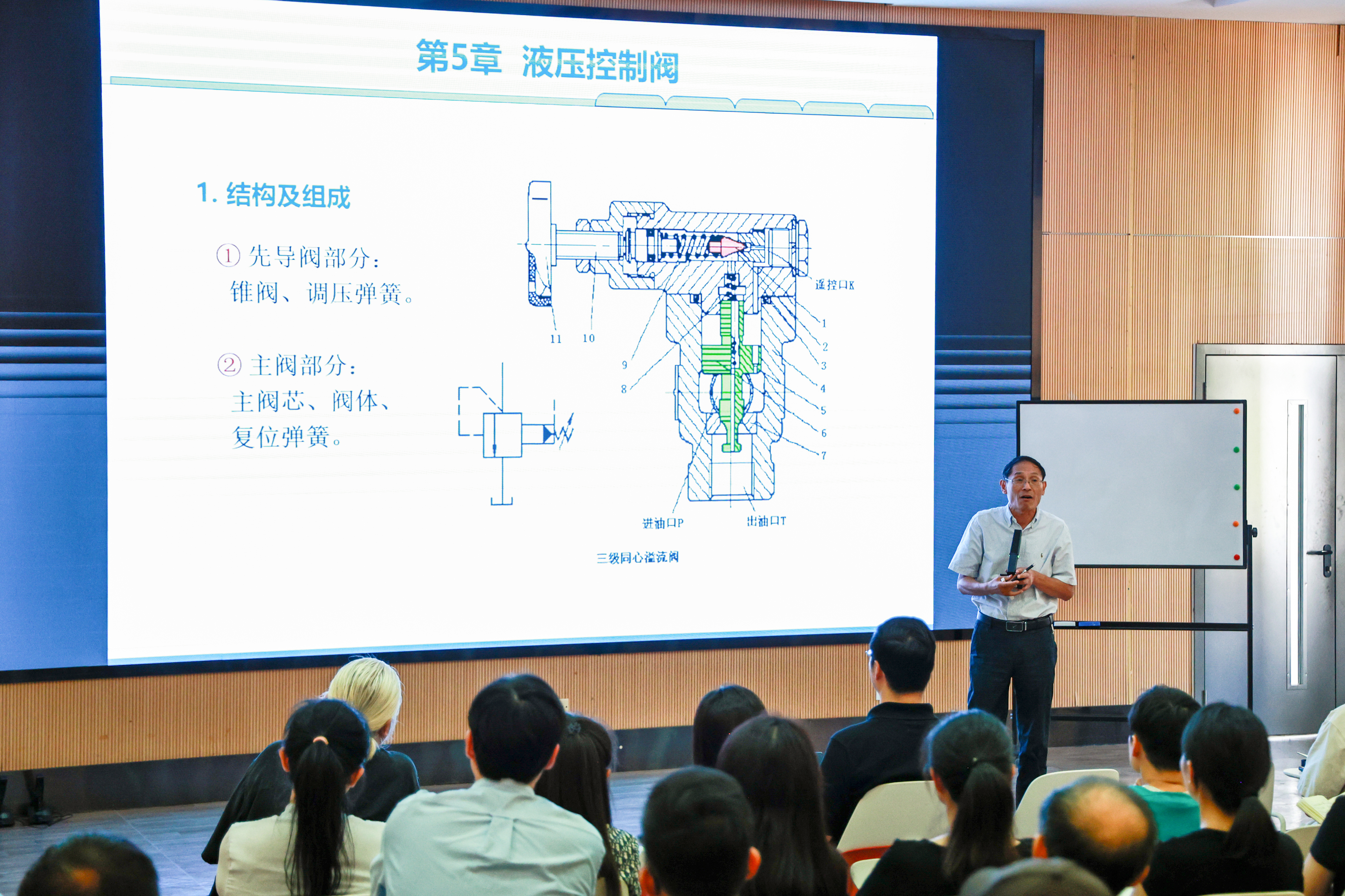 示范课环节,数字科学学院院长李光布教授以“液压控制阀”为主题,从贵州花江峡谷大桥、福建舰舰载机弹射系统等国家重大工程案例切入,系统阐释先导型溢流阀的结构原理与工程应用。课程聚焦遥控口功能等教学难点,通过层层递进的互动设计,引导教师在理论推演中构建系统认知,实现从知识理解向工程实践思维的全面跃升,充分彰显“思维进阶、能力融合”的高阶课堂特质。